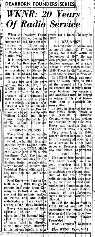 It was just over 20 years ago, on December 29, 1946, WKNR, then known as WKMH, broadcast its first program on a frequency of 1540 kilocycles at the power of one kilowatt from a transmitter at Warren and Hayden streets. At the time, Fred Knorr was in partnership with William McCoy and Harry Hansen.